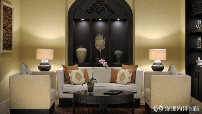在阿布扎比“空白之地”的荒芜沙漠景观中,绿洲已成为永恒生命的象征。Qasr Al Sarab的安纳塔拉水疗中心如若宁静的天堂,真实体现着这种象征。阿育吠陀经典恒久的古老疗法和其他按摩方式、专业的理疗师、用枣和其他异域原料调制而成的治疗补品,诸般呵护定将抚慰您的感官,净化您的灵魂。安纳塔拉致力于挖掘古老传统自然疗法背后的智慧,让您在宁静的沙漠风光中完成这段旅程。Qasr Al Sarab的豪华水疗中心以提供浸浴治疗的土耳其浴室为中心。浴室中采用已传承几个世纪的疗法,助您洁净身心,恢复健康活力。水疗中心位于沙漠深处,隐藏在静谧的庭院之中,潺潺喷泉和芬芳的空中花园点缀其间。